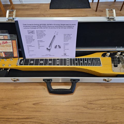 Lap steel guitar, guld med stativ