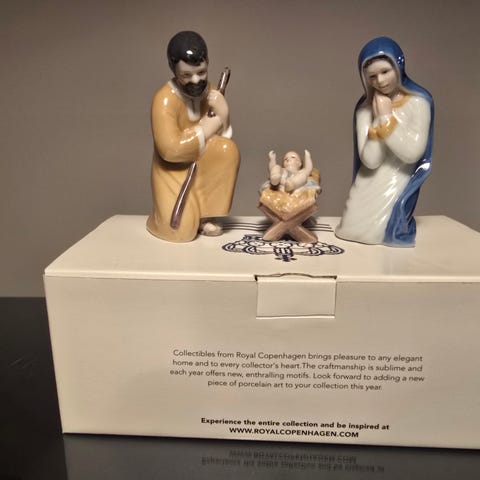Porcelæns krybbespil fra Royal Copenhagen. Tre figurer: Josef, Maria og Jesusbarnet.