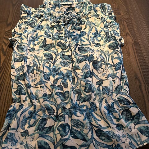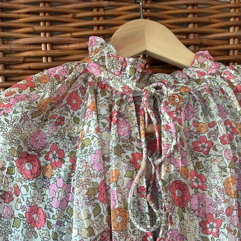 Bluse med et farverigt blomsterprint i gule og pink nuancer. Blusen har korte ærmer og en snørehalsudskæring, der giver et feminint udtryk.