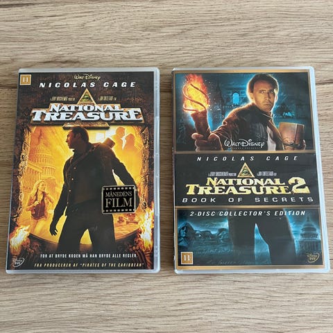 National Treasure 1+2, instruktør Walt Disney, DVD, eventyr, Stand som ny, men de er ikke i folie, der er absolut ingen brugsspor. Den er sandsynligvis u spillet.