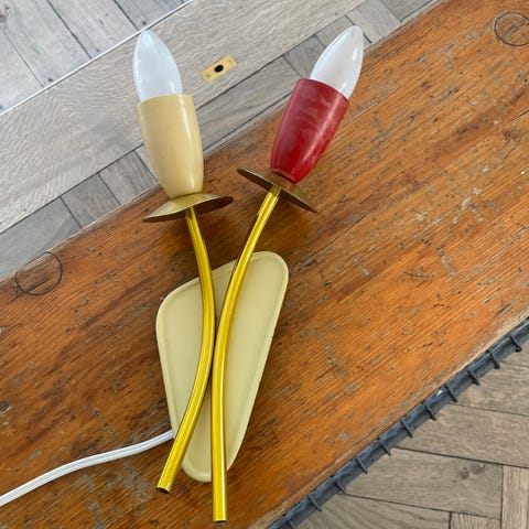 De smukkeste gamle franske Sputnik væglamper (2 stk.), som er udført i messing med bagplade og fatninger i sort.