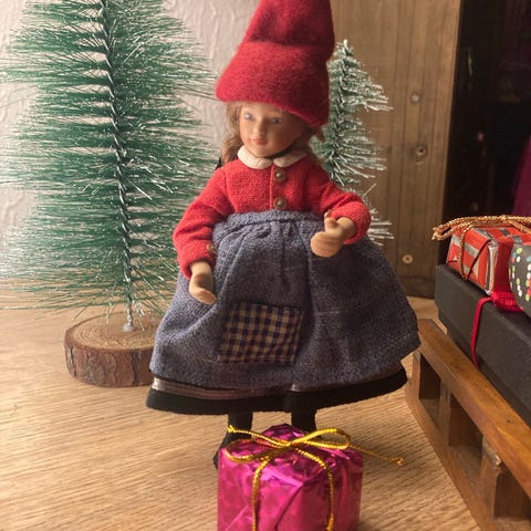 &Tradition Jul Dekorationsdukker til jul, med rød og grå farve. Dukkerne har traditionelt tøj med detaljer som hvidt forklæde og røde huer. Velegnet til juleudsmykning og dekoration.