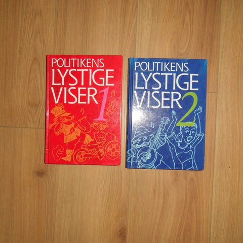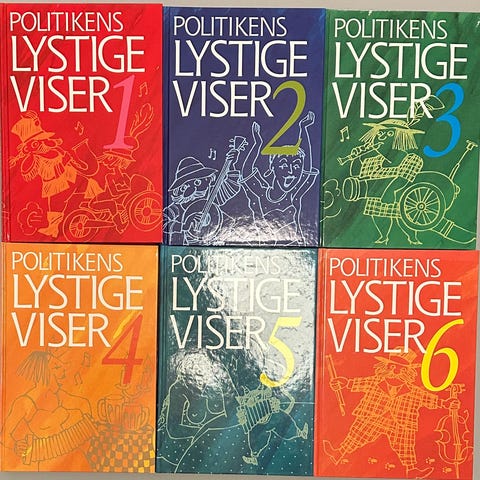 Politikens Lystige Viser er en bogserie bestående af bind 1 til 6. Hver bog indeholder et udvalg af lystige viser illustreret i forskellige farver: bind 1 (rød), bind 2 (blå), bind 3 (grøn), bind 4 (orange), bind 5 (turkis), og bind 6 (rødbrun). Serien er trykt i standard bogformat og egnet til læsning og musikinteresserede.