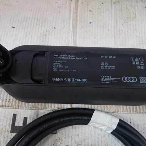 Audi e-tron Oplader Kabel med Type 2 stik, kapacitet på 7,4 kW, sort farve. Kabel til opladning af elektriske Audi e-tron køretøjer med standard stik til hjemmeladning.