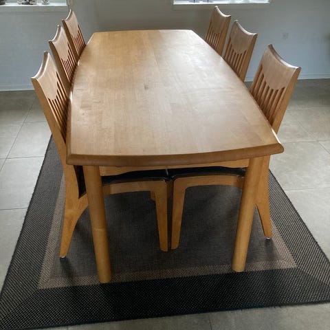 Flot bord 190 cm med 2 bordplader af 50 cm så total længde 290 cm. Plader ligger under bordet når de ikke bruges. Inkl 4 læderstole. Understel i blank metal.