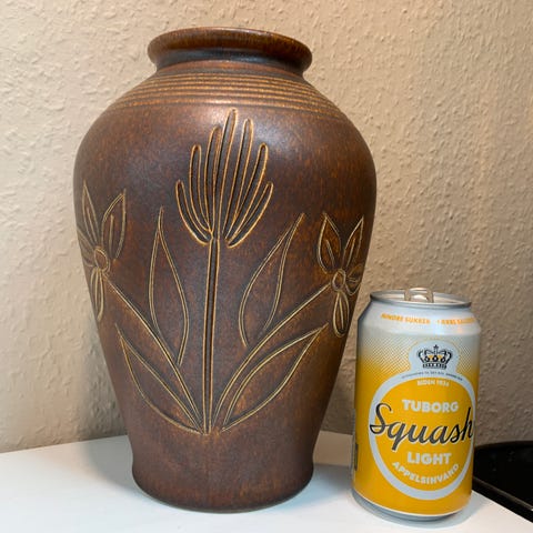 FLOT West germany vase der ikke med sikkerhed kan producentbestemmes da mærkningen er helt overglaseret. Fin buttet form med flot hals med fine detaljer. FLOT mat hvid og brun lavaglasur med flot indvendig blank glasur. FIN retro,!! Vasen er uden skader eller skår