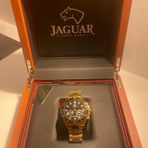 Mega flot Jaguar Hybrid guldur med Sapphire glas og den lækre populære foldespænde på sort gummi rem. Dette ur giver derfor et klassisk mekanisk udtryk på dit håndled og samtidig kan det også forbindes via App, ved at downloade “Jaguar connected” App’en. Står i pæn stand med meget få brugsspor, fin opbevaringskasse og kvittering medfølger.