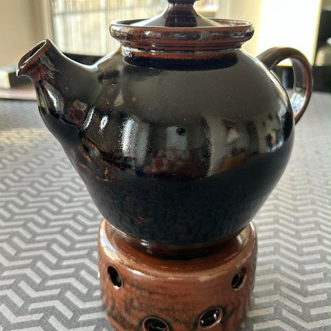 En rigtig lille hyggepotte. Drejet af Palle og dekoreret af Margrethe med en stemning af mellemøstens 1001 nætter. Repareret på lågkant (se foto)