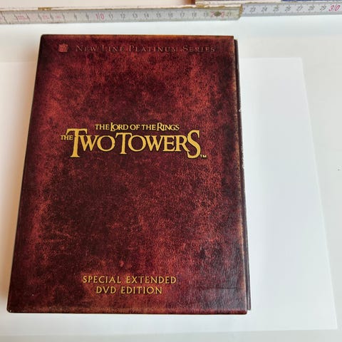 The Lord of the Rings The Two Towers DVD sæt indeholder flere diske med filmen og tillægsmateriale, inklusive appendiks og forskellige dele af filmen. Sættet er i special extended udgave og leveres i en samlet pakke med cover.