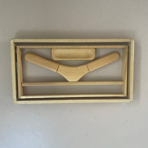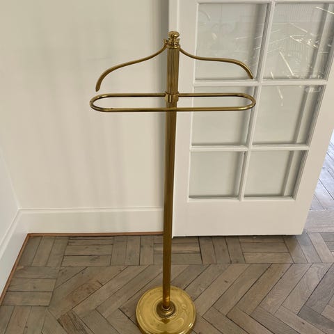 Den er lavet i sort metal med smukke messing detaljer på bukseholderen. Lille teak skål, hvor man kan ligge manchetknapper, ur og mønter.