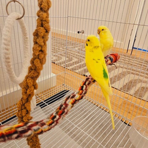 Den ene som er lyseblå hedder Chili han er 3 år og er tam. Han lander på os og kommer helt tæt på, og kan en masse ord på tyrkisk, så han kan sagtens trænes til mere. Vi har ikke haft tid til ham et godt stykke tid så han har desværre ikke været ude og flyve så meget.