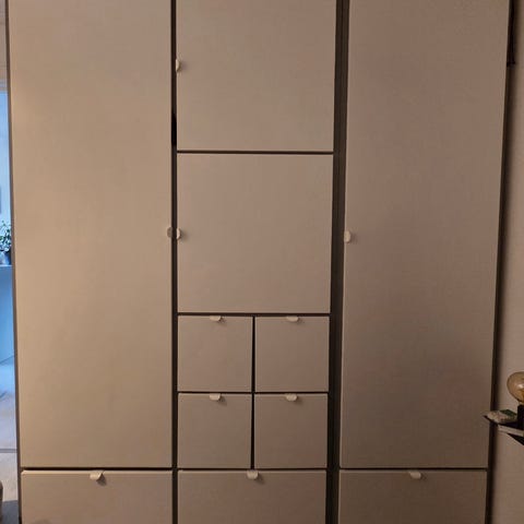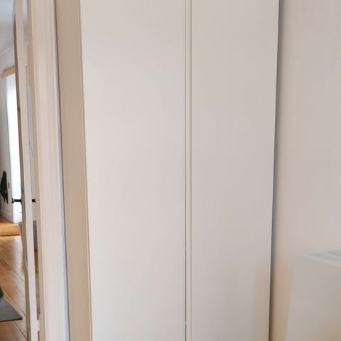 Skabet er skilt ad. Og der er en hylde der har en lille revne i laminaten. Revnen dækkes af tværhylden. Så det ses ikke når skabet er samlet.