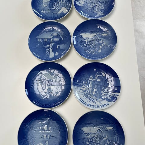 Bing & Grøndahl Juleplatte sæt bestående af 23 stk. blå porcelænsplatter med julemotiver. Platterne har forskellige designs, der afbilder traditionelle juletemaer. Hver tallerken er dekoreret i blå og hvid farve, velegnet til samling eller dekoration.