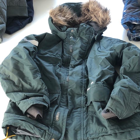 Rigtigt fin flaskegrøn vinterjakke fra Didriksons str. 100. Fin stand. Jakken er fremstillet i vandtæt materiale og har en aftagelig hætte med aftagelig pelskant. Den har justerbare ærmer med ekstra indvendige ærmer for ekstra beskyttelse mod vind og vejr.
