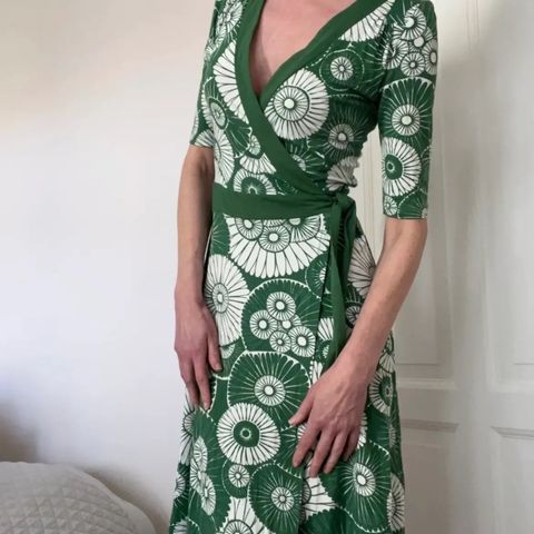 Fin slå-om-kjole i præget stof med detaljer ved ærmer og snor som bælte. Materialet er viskose. 123 cm lang