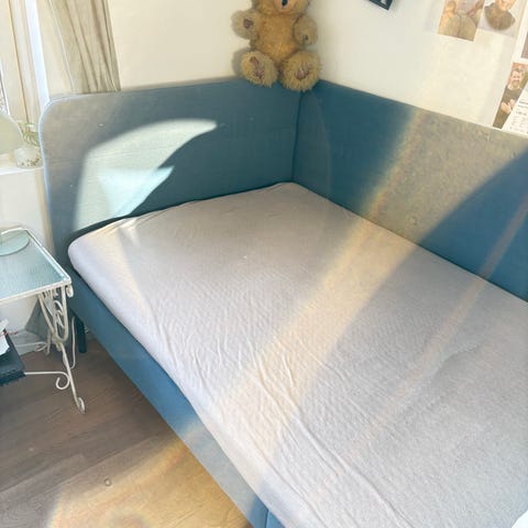 3 år gammel meget velholdt seng inkl. madras, fx til børneværelset. Sengegavlen er hyggelig og rar at sidde op ad. Madrassen er en næsten ny skummadras. Nypris for madras 1500 kr. og nypris for seng 1000 kr. Sælges samlet for 1000,-