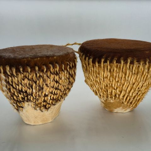 Samling af træfigurer og tromme legetøj bestående af to figurer med grønne fødder og røde hænder, en tromme med snore og en lille båd med to pinde. Materialet er træ med detaljer i forskellige farver som brun, orange, grøn og rød. Produkterne er håndlavede og velegnede som dekorative genstande eller legetøj.