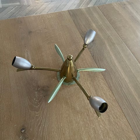 Smuk gammel sputnok lampe, med 5 messing arme hvorfra der er 5 farvede fatninger i farverne orange, hvid, sort, grå og lime.