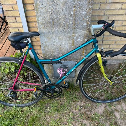 Skal have ny kæde og justeret bremser, ellers er den i god stand med klik-pedaler. 59-60 i stel str.