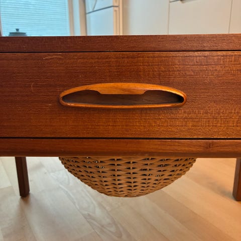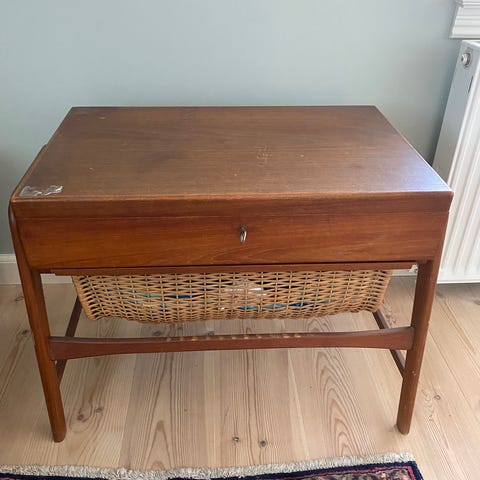 Ældre sybord som har været i familiens eje siden 1960erne, har patina og er originalt.
