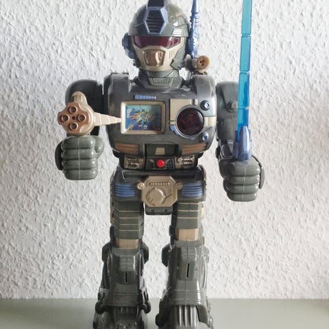 Denne seje robot dino kan stadig bevæge sig og kan brøle lyde, men jeg kan desværre ikke få den til at snakke med fjernbetjeningen (som lyser så der er strøm på men den får ikke dino til at gå). Så tænker den skal repereres men ellers er den stadig sej.