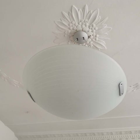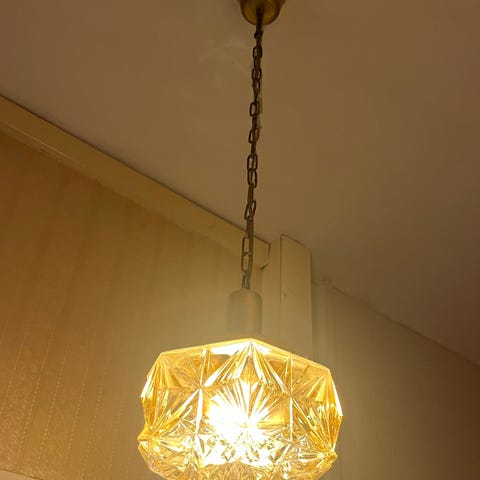 Vintage Design klassiker inspireret af Gio Ponti eller Louis Kalff stil i satin glas med konisk form. Lampen har en tekstureret overflade med et snoet mønster og udsender et blødt lys. Velegnet til brug som stemningsbelysning i stue eller soveværelse. Stilen er fra slut 1950 til 1970. Toppen af lampen er i antik messing finish. Mål højde 35 cm og diameter er 17,5 cm