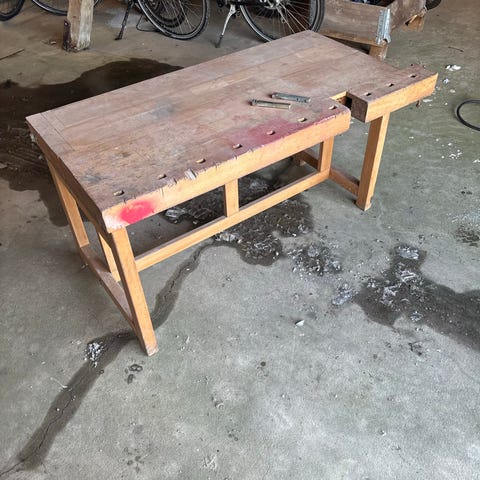 Workmate arbejdsbord med træbordplade og metalstel. Bordet har en robust konstruktion med skruetvinger og fodstøtte i metal. Velegnet til håndværks- og reparationsopgaver.