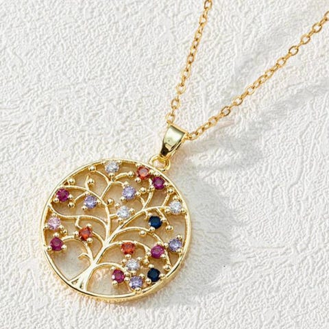 Forgyldt halskæde med et utroligt flot vedhæng med Livets Træ motiv i smukke farver. Motivet er under (plexi)glas, sp det skinner flot. Hele vejen rundt i kanten er der klare skinnende sten. Vedhænget er 3,5 cm i diameter og kuglekæden er 60 cm. Halskæden er ny
