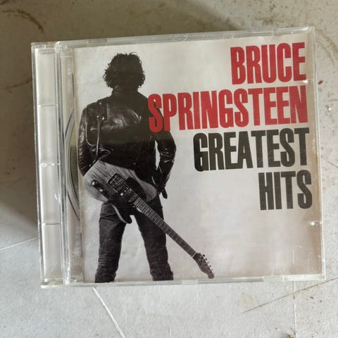 Bruce Springsteen Greatest Hits CD featuring a collection of popular tracks including 'Born to Run,' 'Thunder Road,' 'Badlands,' and others. The CD is in a standard jewel case with cover art showing Bruce Springsteen holding a guitar. Track listing is printed on the back cover and on the CD itself. Dba 2