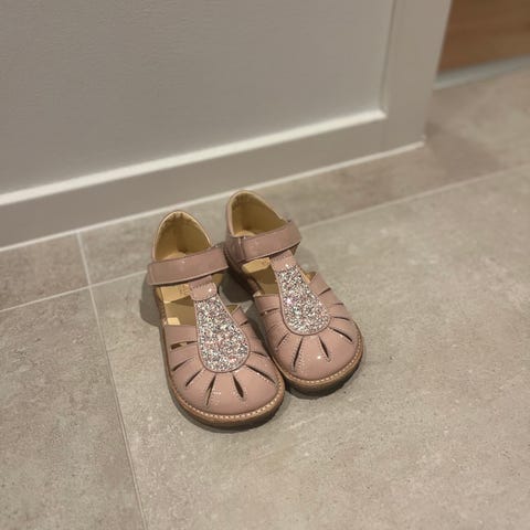 Angulus børnesko til pige i størrelse 24. Skoene er fremstillet i rosa læder og har et hjerteudskåret design på fronten. De har justerbar rem med velcrolukning for god pasform.