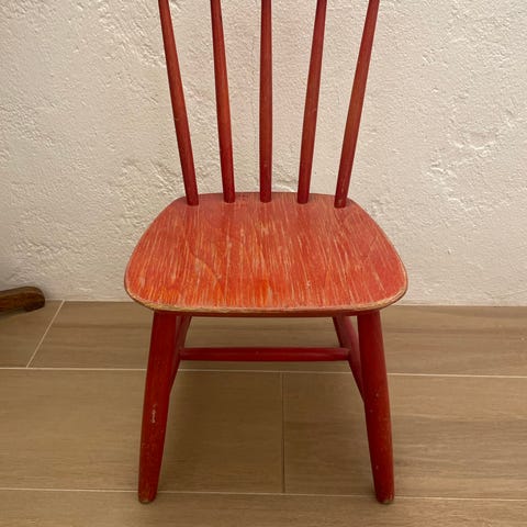 Lille fin børnestol. Den er oprindelig rød, men vinger malet den lilla. Den har nogle skrammer, men selve stolen fejler ikke noget.