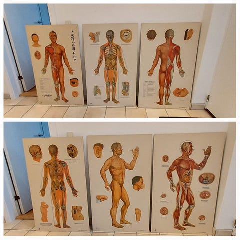 Meridianplanche som er lamineret En farverig planche af meridianerne på menneskekroppen. Meridianerne er vist forfra, bagfra og fra siden i farver som er tilsvarende pågældende element. Punkterne for elementerne på hænder, arme, fødder og ben er også angivet samt akkumuleringspunkter, lo punkter, kilde punkter.