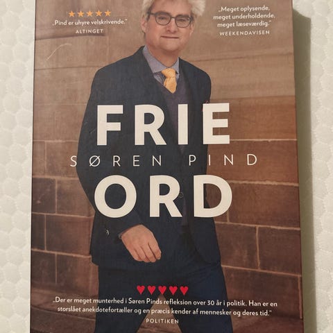 Søren Pind Frie Ord bog med forsidebillede af forfatteren iført en mørk jakke. Bogen er på dansk og indeholder indhold relateret til Søren Pind.