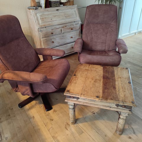 Lækre lænestole i god stand sælges. Hynder er lavet i 100% uld. Der er enkelte huller i hynderne. Skal hentes snarest!