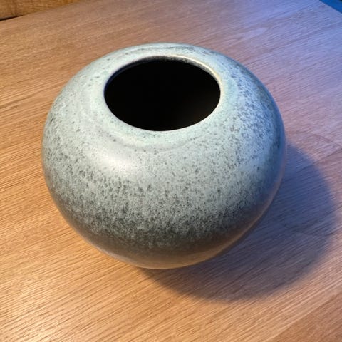 Grå blå udenpå med lidt mere grønlig glat glasur indeni