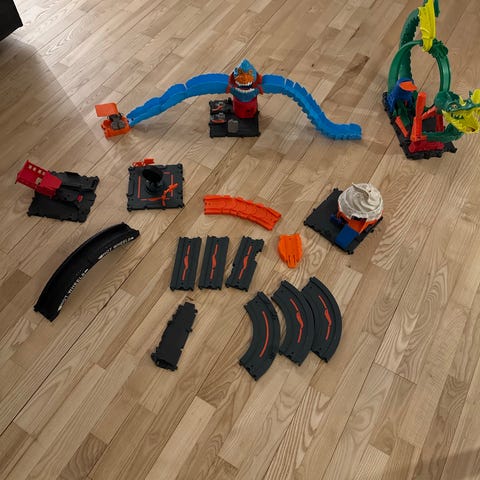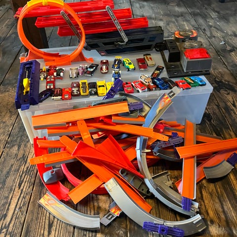 Hot Wheels legetøjssæt indeholder fleksible racerbaneelementer i forskellige farver, flere små biler, og diverse tilbehør såsom broer, bygninger og figurer.