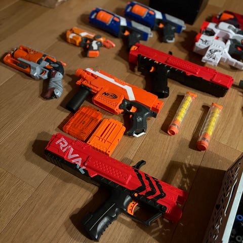 Nerf legetøjssæt bestående af flere forskellige dele og tilbehør, herunder magasiner, dartpistoler, sigtekikkerter, og opbevaringskasser. Farverne er primært orange, blå og sort. Sættet indeholder forskellige størrelser og typer af dartpistoler samt tilhørende magasiner og ekstraudstyr. Egnet til børn til leg og målskydning.
