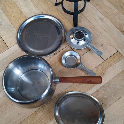 Retro fondusæt med fondugaffler. Fint retro fondusæt i rustfrit stål. Diameter på åbning 13 cm. Fondugafler med træskaft.