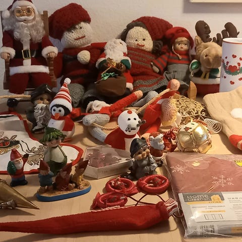 En samling af forskellige julenisser og andet julepynt: Bla. en hvid strikket kattebamse med rødt halstørklæde og en strikket "marcipangris", en nissehuse med æseldyret samt andre små delvist hjemmelavede nisser.