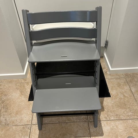 Stokke Højstol med grå betræk og sikkerhedsseler
