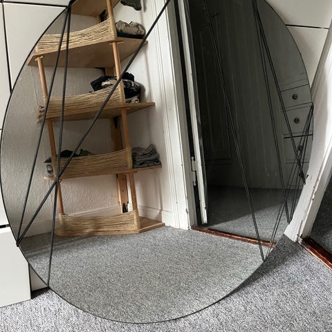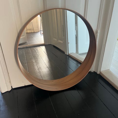 Fint, rundt spejl i egetræsfiner. Nypris 550 kr - sælges for 150 kr.