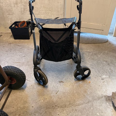 Rollator med mulighed for at sidde på. Ryglæn kan pilles af. Letvægt aluminium.