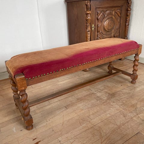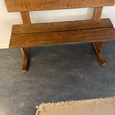 Træbænk med polstret sæde og ryg i beige mønstret stof