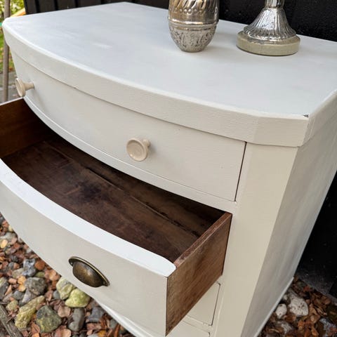 Fin gammel (måske teaktræ) med rigtig mange lag maling. Trænger til en kærlig hånd.
