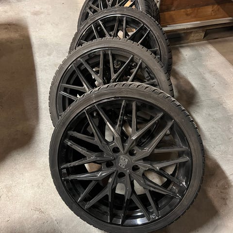 Kleemann fælge i sort i størrelsen 2 stk 10x19 og 2 stk 8,5x19 med Fine Dunlop SP Winter Sport i str 295/30/19 og 235/35/19. Mercedes/AMG/Audi