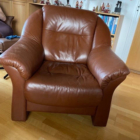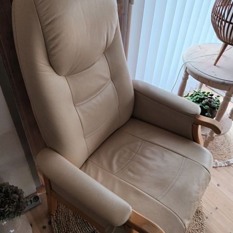 Lys rød/brun læder lænestol med bøge sokkel med drejefunktion