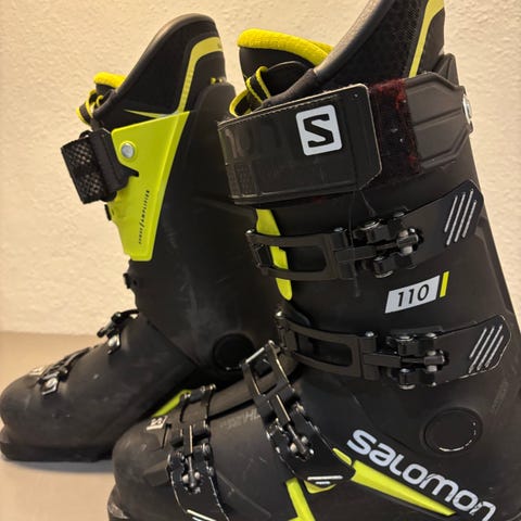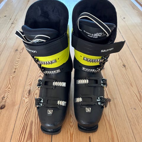Salomon S/Pro MV 90 skistøvler i størrelse 25 cm. Farven er sort med guld detaljer. Skistøvlerne har justerbare spænder og en robust konstruktion designet til at give støtte og komfort under ski.