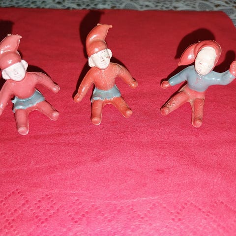 3 ældre pynte nisser i porcelæn. Forskellige. Aldersrelaterede brugsspor i form af afskalninger- se venligst fotos. Mål se fotos.