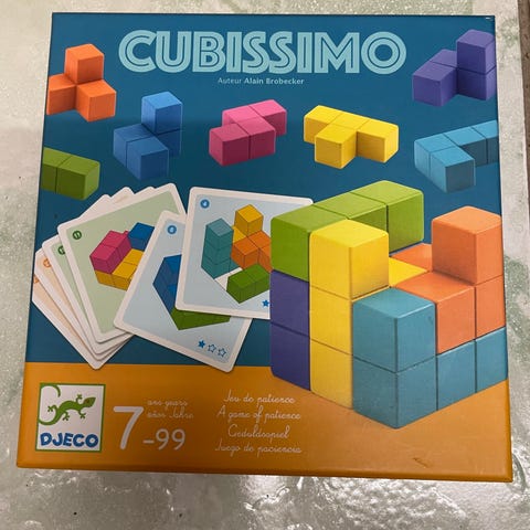 Djeco Cubissimo brætspil med puslespil, indeholder farvede klodser i forskellige former. Spillet inkluderer kort med opgaver i varierende sværhedsgrad, der skal løses ved at bygge 3D-figurer. Egnet til børn fra 7 år og opefter.