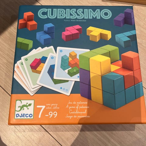 Djeco Polyssimo brætspil med farverige geometriske brikker i forskellige former. Spillet indeholder et spillebræt med ternet mønster og instruktioner. Egnet til børn fra 7 år og op. Materiale og præcise mål er ikke angivet. Spillet fremmer rumlig forståelse og problemløsning.